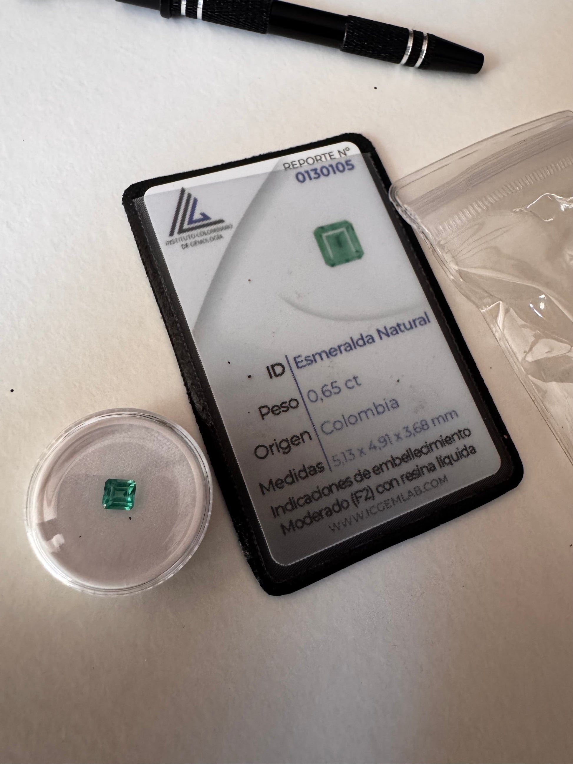 All of our emeralds are directly sourced from the legendary emerald mines of Colombia, this 0.65 carat emerald cut gemstone combines precision cutting with vibrant green color. Certified by the Instituto Colombiano de Gemología (Report No. 0130105), this emerald showcases classic step-cut faceting that highlights its natural clarity and inner character.